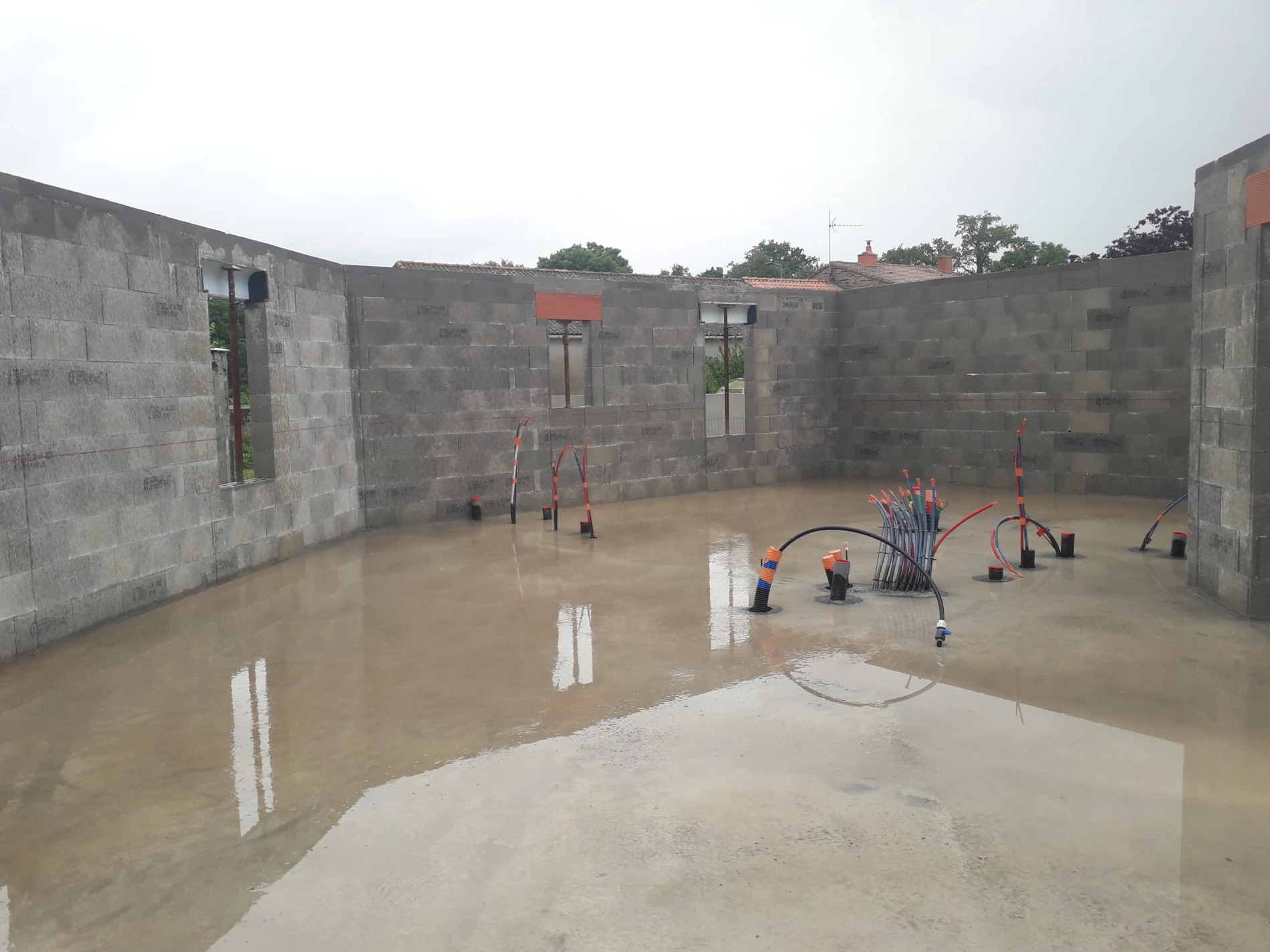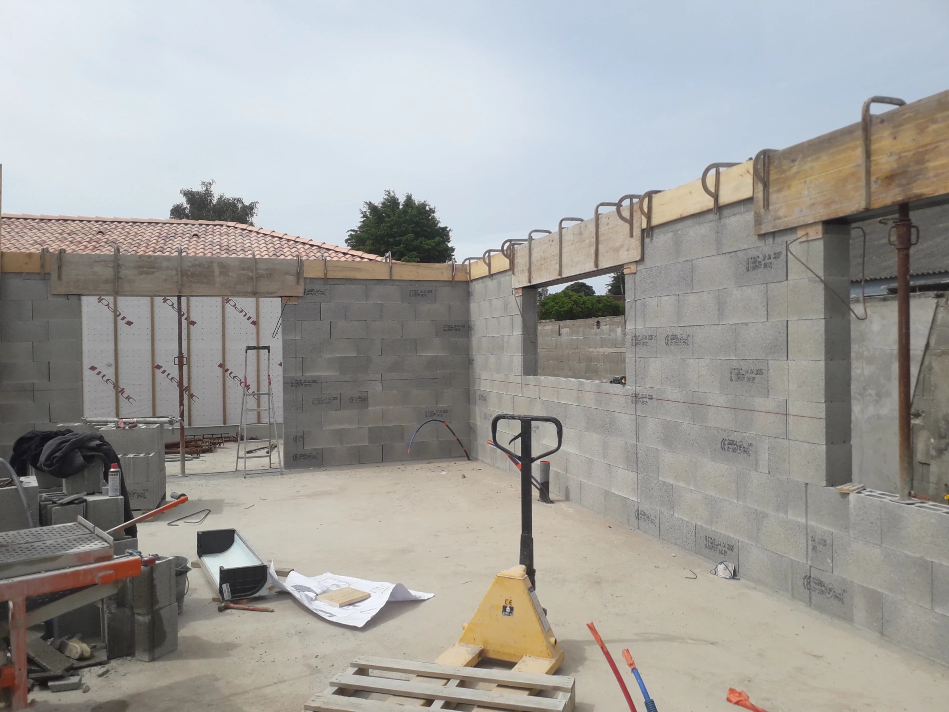 Les murs ont été montés en parpaings rectifiés, une solution performante offrant précision, solidité et meilleure isolation thermique. Après l’implantation du premier rang, les équipes ont poursuivi avec la pose des linteaux et des coffres de volets roulants, éléments essentiels à la structure du bâtiment.