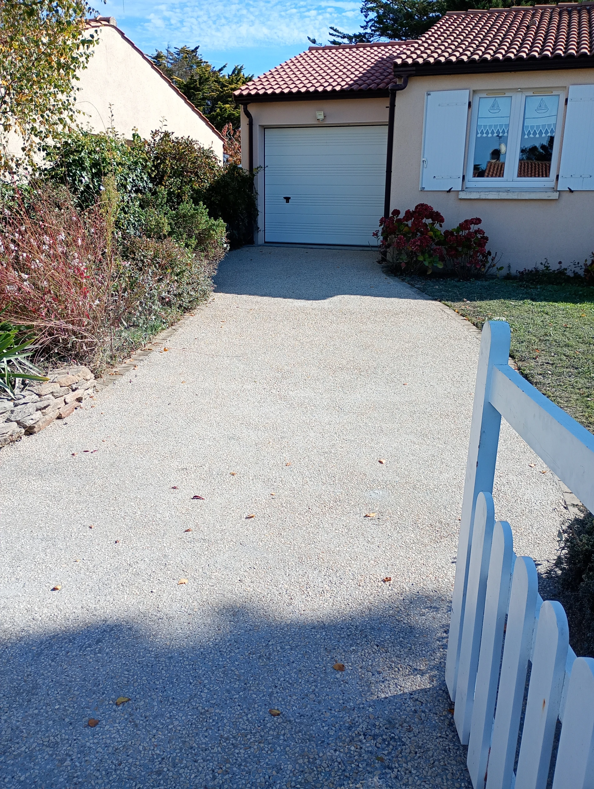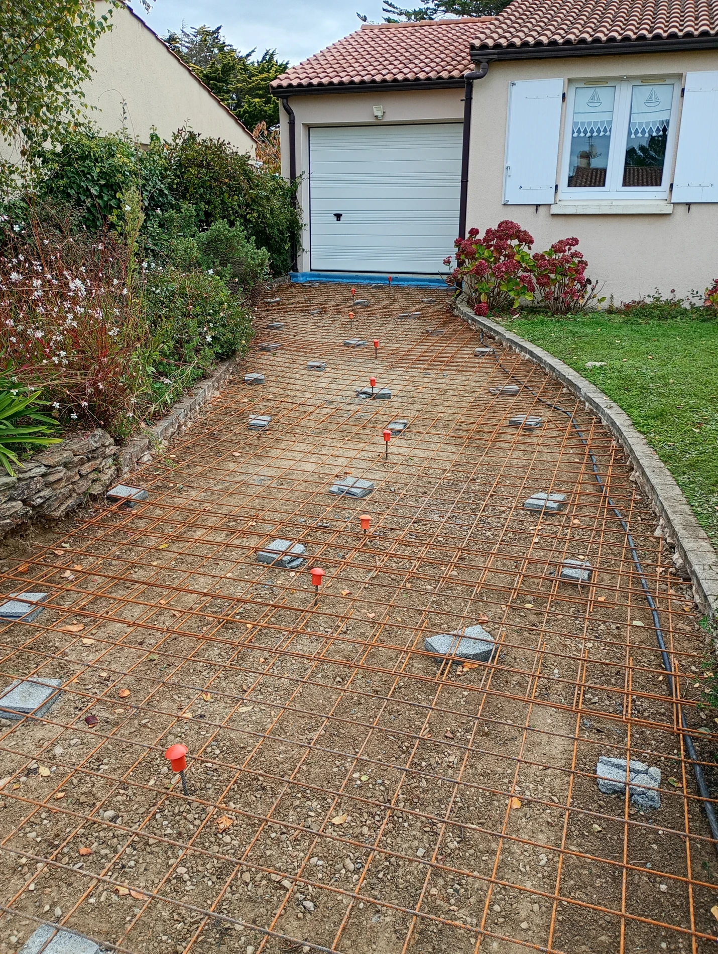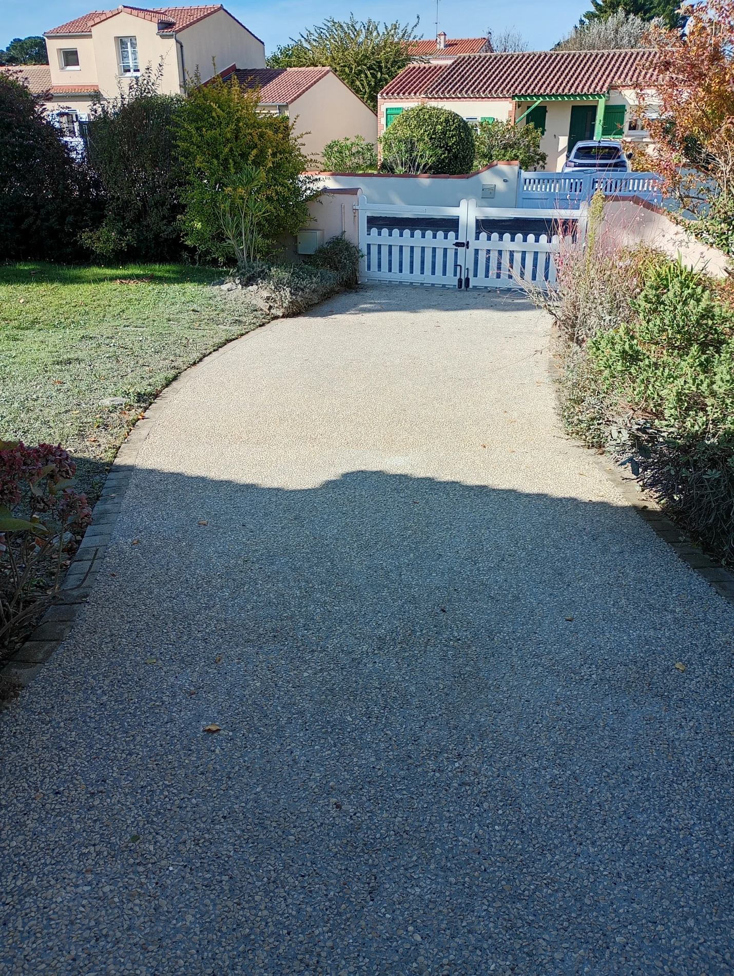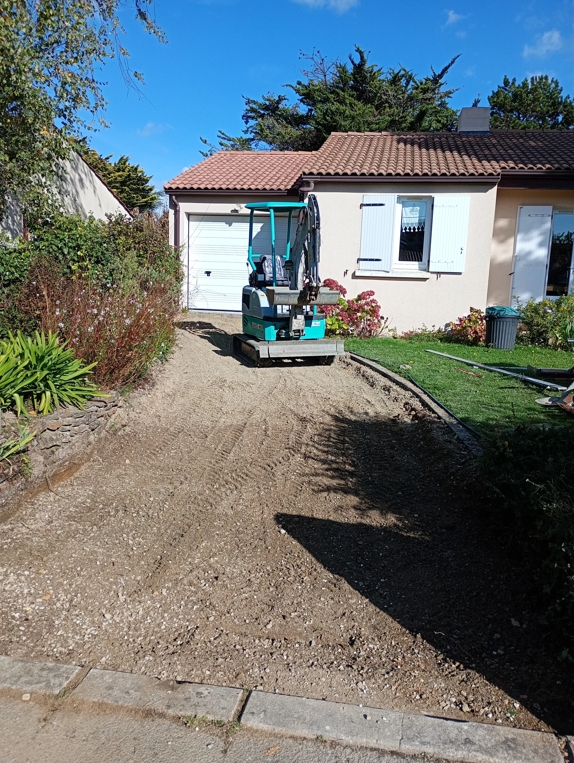 L’objectif principal de ce chantier était de supprimer les problèmes d’eau stagnante tout en proposant une allée carrossable pratique et élégante. Après étude des différentes options, le béton désactivé s’est imposé comme le meilleur compromis pour répondre aux attentes de la cliente.
